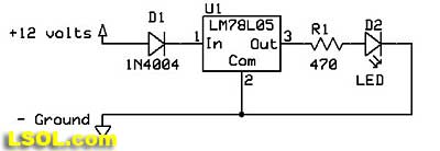 If you use more than 12 volts it is a good idea to touch the regulator and make sure it is not heating up as excess power must be dissipated as heat. Note that the symbol for the diode, D1, has a vertical bar on the right side in this schematic. Diodes must be installed with the proper orientation or they will not work properly.
