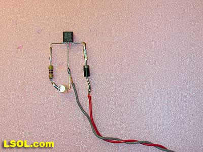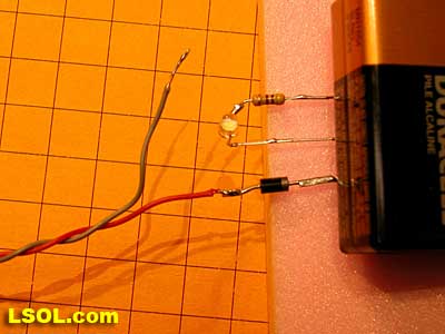 Tin the positive end of the diode then solder the positive (red) wire to it. In the photos below the battery is being used as a weight to hold the components in place for soldering.