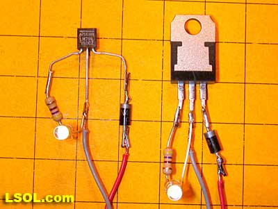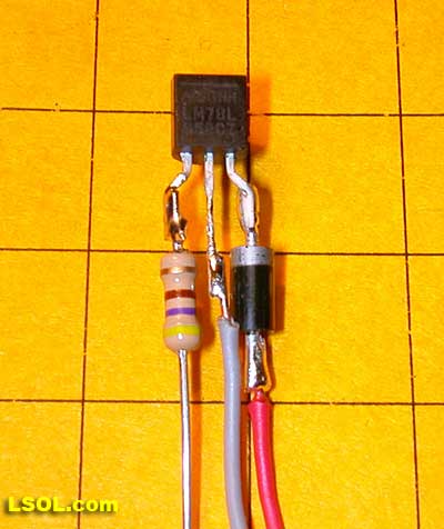 The wiring for the larger 7805 voltage regulator is identical with one exception, as you can see from the photo below. The 78L05 is wired with its labeled, flat face towards you but the 7805 is wired with the labeled face away from you.