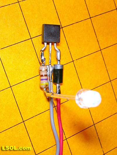 The negative, shorter, LED lead goes to the center lead of the regulator and the positive lead of the LED goes to the resistor. Power leads are soldered to the center and right hand leads of the regulator.