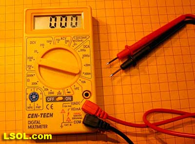 The meter used here is a very inexpensive unit that is available from HarborFreight.com for under $10.00. I have seen them on sale for less than $5.00 at the local Harbor Freight store.