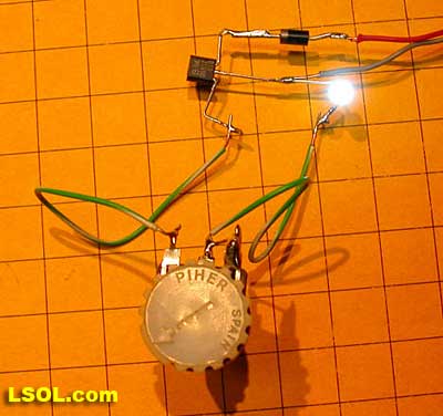 Note the wiring of the pot in the schematic and photo below. It has 3 leads, one on either side and one in the center. The center lead and the one on the right are wired together.