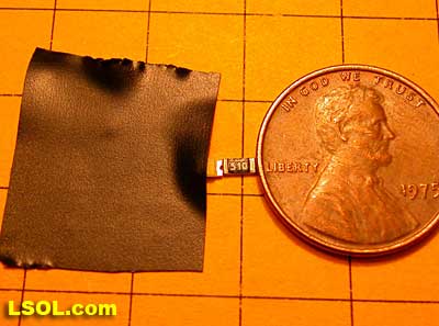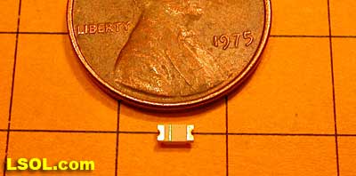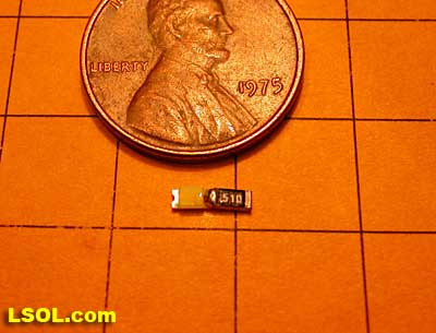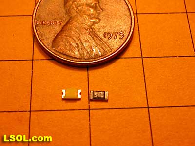 If space is at a premium and you have a good magnifying glass, surface mount LEDs and resistors can be used. The device on the right, marked 510, is a resistor and the other device is the LED.