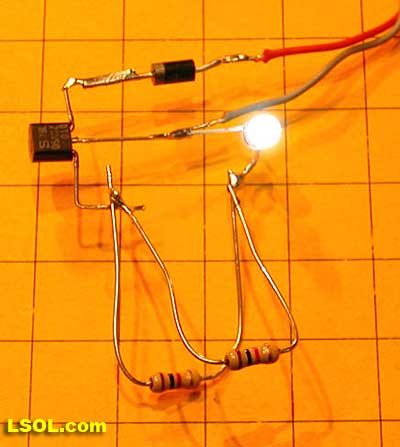 - The circuit used here is ideal for a headlamp on an engine as it will only light when the voltage is applied with one polarity. Test the polarity when installing the light so that the LED lights when the engine is going forward.