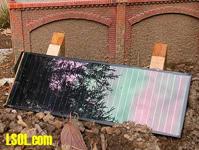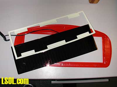 It is much easier to conceal this unit if you separate it from its bright red enclosure. Removing 11 screws from the back of the case reveals the 4.25" x 12" glass panel to which the cells are bonded. Protect the edges of the glass with tape or a layer of black silicon seal. Another option is to reuse the beige rubber edging, seen in the photo, after painting it black so that it is less visible.