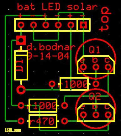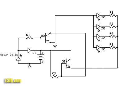 Circuit The circuit has two jobs. It charges the batteries when sunlight is present and turns the LEDs on when darkness comes. This is accomplished with two transistors, a diode and a few resistors.