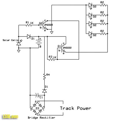 If your trains run under track power, a simple modification to the circuit allows for quicker charging of the batteries while your trains run. This could come in handy if you are having friends over during the winter months and want to show off your lighted buildings but clouds have kept the time that they are illuminated down to a few hours.