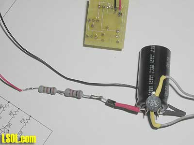 Capacitors usually have a stripe to indicate the negative terminal. The two resistors in series can be seen to the left of the diode and capacitor. I simply connected the output from the circuit to the bottom of the board where the battery hooks up.