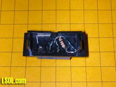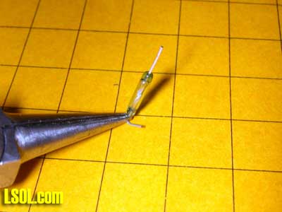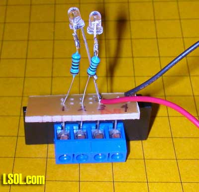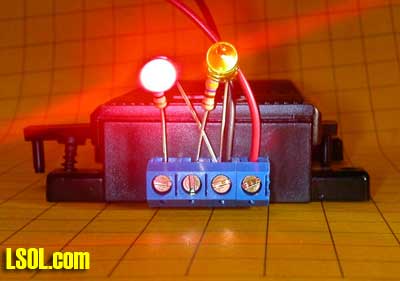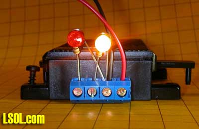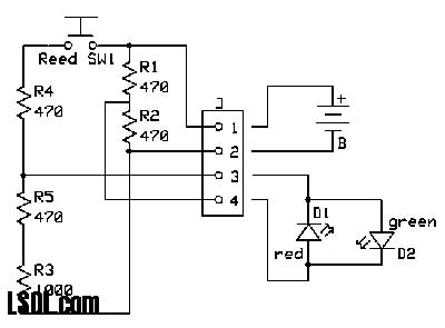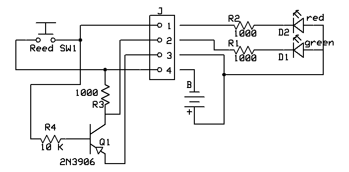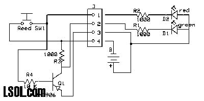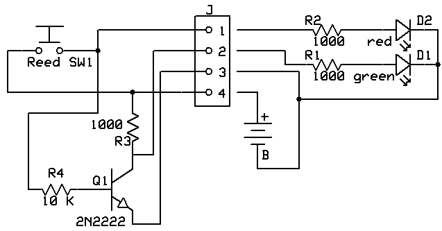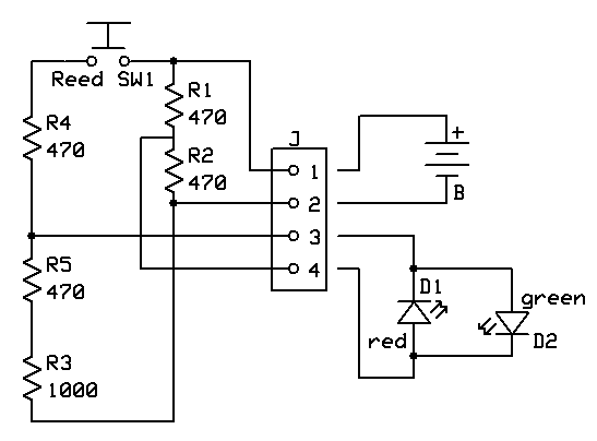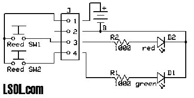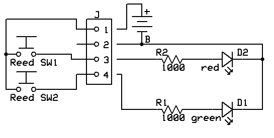 Turnout Signal Lights The objective of this project is to design and construct an add-on device for an LGB turnout motor (part 12010 or 1201) that will light a red or green LED on a turnout signal light. Although this can be accomplished by adding an LGB switch unit (part 1203) to the turnout motor, the difficulty in obtaining LGB parts makes it prudent to explore other options. Introduction A few months ago Noel Widdifield contacted me about helping him to connect a set of 10 signal crossing lights to each of his 10 turnouts so that the appropriate LED would light indicating the orientation of the switch. The signals were from Sorry: this link is no longer available from source. Shiloh Signals. Each signal contained one green and one red LED. After corresponding with the folks at Shiloh I found that each signal had 3 wires coming from it. One wire goes to the cathode of the red LED, one wire goes to the cathode of the green LED and one wire connects to both of the anodes of the LEDs which are connected together within the signal.  In a setup like this you simply connect the positive voltage from your DC power supply to the common anode lead and connect the negative terminal to the cathode of the LED that you want to light. This type of LED wiring is called, for obvious reasons, "common anode" wiring. As mentioned above, we would have used LGB's 1203 units had they been readily available. Since we could not find a source for ten 1203's other methods were explored. How LGB's Switch Unit Works The LGB 1203 is a DPDT (Double Pole Double Throw) add-on device that attaches directly to the end of the LGB turnout motor. It is made up of two identical SPDT (Single Pole Double Throw) switches that are thrown one way or the other depending on the switch motor's position. To install this unit a cover pops off of the end of the switch motor and the 1203 is added. As one would expect there are six wire connection terminals on the 1203. Two terminals are common, two are normally open and two are normally closed. Alternatives to Using the 1203 A number of alternatives were explored when seeking a solution to this problem. Among them were using small SPDT micro switches similar to those used by LGB. Since we are only interested in controlling one signal light (containing 2 LEDs) a single SPDT switch is all that is necessary. Although small switches are available this solution was rejected due to the difficulty in aligning the switch properly so that it reliably indicated the position of the switch. The preferred solution uses one or two magnetic reed switches. Some reed switches are so small that they can easily be installed inside of the end of the LGB switch motor. This allowed us to use the cover that is normally removed when the 1203 is installed to mount the reed switches and any other components. In this photo you see the end plate from an LGB switch motor that has a small reed switch mounted on it. Another reed switch is below the penny. Note that this end plate is included with every LGB switch motor and is normally removed and discarded when the 1203 is added.  This is a view of the inside of the turnout motor cover showing the two reed switches that, when wired together, comprise a SPDT switch. If you look carefully you will note that the two inner contacts are soldered together.  The only other modification to the switch motor is the addition of a small permanent magnet to the arm that moves inside of the switch motor. This arm moves left or right when the switch is thrown. In this photo the magnet is the silver object to the right of center. Note that the switch throw arm is also to the right. When the switch throws the other way the arm and magnet both move to the left. The magnet is glued to the center of the movable arm with a small amount of epoxy.  Wiring with Two Reed Switches The wiring diagram below shows how the signal lights are wired if two reed switches are installed inside of the switch motor. The two reed switches are wired together so that they act as a single SPDT switch. When the magnet moves to one side switch SW1 is turned on and SW2 is off. When it moves to the other side SW1 is off and SW2 is on. The 1000 ohm current limiting resistors (R1 and R2) are installed within the signals themselves. The parts to the left of the 4 terminal connector are inside of the end plate on the switch motor. The terminal block is installed on the outside of the end plate. Here we see two test LEDs and the red & black connections that supply 12 volts DC.  Only three of the four wires from the signal are connected to the circuit. This is due to the wires from cathodes of the two LEDs being tied together at the signal. Note that this wire and the negative terminal of the battery or power supply both go to connection #2. The positive power connection goes to #1. If the LEDs do not light in the proper order, that is if the red LED lights when the green one should be lit, just switch the connections at #3 and #4. Another Wiring Solution The above circuit uses two reed switches to make up a SPDT switch. I found that both reed switches can be activated if the magnet that is glued to the movable arm is too strong. A more reliable system uses only one reed switch that can be placed far to one side of the base plate. The wiring diagram below shows how it is wired. The parts to the left of the 4 terminal connector are inside of the end plate on the switch motor. Resistors R1 and R2 make up a voltage divider that supplies approximately 1/2 of the supply voltage to terminal 4. Note that the two LEDs are wired in parallel with anode to cathode and cathode to anode. Resistors R3, R4 and R5 are current limiting resistors. Their values can be modified if the LEDs have internal current limiting resistors. When reed switch SW1 is open the red LED lights. When SW1 is closed the green LED is lit. The only disadvantage of using this circuit is that you must adjust the values of the resistors to get both LEDs to l