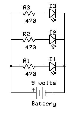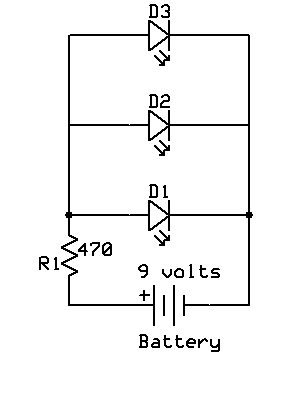 The number of additional LEDs that can be added to this parallel circuit is only limited by the amount of power that your battery or power supply can provide. Even with just a 9 volt transistor battery 10 or 20 LEDs should not be a problem. The battery may not last too long with 20 LEDs but it will light them! If space is an issue you can try using just one current limiting resistor for multiple LEDs. The only restriction is that all of the LEDs need to be identical. Even then, there is no guarantee that all of the LEDs will shine with the same intensity if only one resistor is used. I have successfully used this technique for a multiple-LED beacon on top of a model radio tower. Note where the resistor is placed, close to the battery's positive terminal, so that it limits the current going to each of the LEDs.