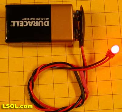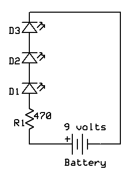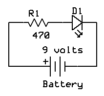 A Simple LED Tester In theory one should mathematically or experimentally determine the proper current limiting resistor for a particular LED being supplied with a particular voltage. In reality a 470 ohm to 1000 ohm resistor will work with just about any LED for any voltage we are likely to use in garden railroading. There is a simple circuit that you can make that takes advantage of this fact and will safely test most LEDs. The test circuit that I use most often is battery operated and consists of just a few parts. This illustration below shows the schematic for the tester. The LED is labeled D1. Its anode goes to the left and its cathode goes to the right. R1 is the 470 ohm current limiting resistor. The 9 volt battery is at the bottom with its positive terminal to the left.