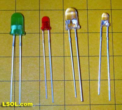 LEDs 101 Introduction LEDs have rapidly taken the place of incandescent light bulbs in many, if not most, model railroad applications. Although LEDs have been the topic of many LSOL articles, questions that I see in the forums and that I receive in emails tell me that a review of their characteristics and use is in order. In addition I have discovered a number of interesting LEDs and ways of using them that I don't think have been presented here before. Let's take a few minutes for review and a few minutes more to see if we all can learn some new tricks with these fascinating and useful devices. Review - Physical Characteristics LEDs are available in a number of different sizes and shapes with most being round topped cylinders that are either 3 mm or 5 mm in diameter. These sizes are also commonly referred to as T1 (3 mm) and T1 3/4 (5 mm). The body of most LEDs is made of plastic that is either the same color as the lit LED, generally referred to as a diffused LED, or of a completely transparent plastic. As a rule the clear LEDs are brighter than the diffused ones. The two LEDs on the left in this photo are diffused, the two on the right are clear. You can see the relative sizes of the 3mm and 5mm units, as well.