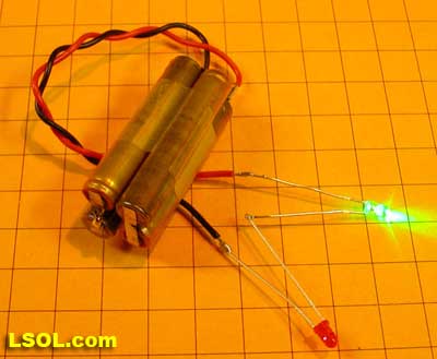 In the photo below I am using 4 of the tiny 1.5 volt cells from a disassembled 9 volt battery to power the above circuit. The cells, from the nearly dead 9 volt battery, supplied just under 5 volts. The flashing LED is the red one at the bottom. Note the dramatic difference in brightness between the two LEDs. The green one is a standard high intensity LED that is flashing in unison with the red one. I intentionally left the wires long so that you could see what is connected where. The longer lead from the green LED goes to the positive wire from the battery. The shorter lead from the red LED goes to the battery's negative wire. The longer lead from the red LED is soldered directly to the shorter lead from the green LED.  To use 9 volts or more with the above LEDs just insert an appropriate current limiting resistor in series with one of the power leads.