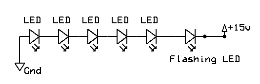 Multiple Flashing LEDs I experimented a bit adding one then another bright green LED in series with the other two. Each time I had to increase the voltage a by about 3 volts as the green LEDs will not illuminate until each one sees nearly 3 volts. I have to admit that I was amazed by the results from experiment you see below. There are 5 bright green LEDs and one red flasher, each wired anode to cathode with no current limiting resistor at all. The circuit is being supplied with 15 volts. The amazing thing is that the red LED's flashing circuitry did not fry from the power that is going through it. I suppose you could try adding a few more LEDs but as it is this array would really brighten up a runway, building beacon or other structure. As a test I let this run on the bench for nearly a week and it worked just fine. Chances are it will operate indefinitely.