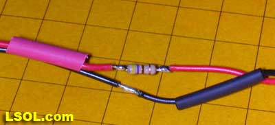Here the 470 ohm resistor has been soldered to the back of the clip. Note that the resistor goes to the female part of the clip which connects to the male (positive) contact on the battery.