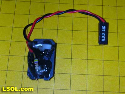 A 9 volt transistor radio battery, 9 volt battery power clip (Radio Shack #270-324), a 470 ohm resistor and a two conductor plug is all that is needed. The two conductor plug makes it a snap to insert an LED into the circuit for testing. These plugs can be salvaged from the innards of an old desktop computer. There are usually a number of these plugs inside of the computer's case. They are used to connect the front panel switches (power, reset, etc), speaker and LEDs (hard drive, power, etc) to the computer's motherboard. The one shown below was used to connect the computer's hard disk LED to the motherboard.