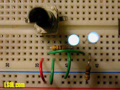 If the potentiometer's knob is rotated full left one LED lights fully and the other is out. If it is rotated to the right the opposite happens. Any position in between has one brighten as the other dims. I am sure you know what happens if it is the center position!
