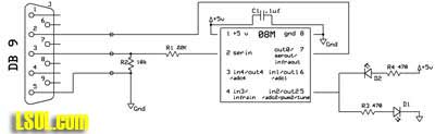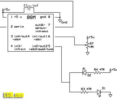 This is exactly what the ditch lights need to do. By controlling the PWM output the Picaxe can easily control the brightness in the two LEDs. If the LEDs are well matched with the same value current limiting resistors they will be balanced and change in intensity as one goes up and the other down in brightness. PICAXE Connecting the LEDs to the Picaxe is very simple. It is just a matter of connecting the Picaxe pin that is putting out PWM to the LEDs. In the schematic below all of the items to the left of the Picaxe (the DB9 and two resistors) are only needed to program the Picaxe. If you are using a pre-programmed Picaxe or are programming it on another board all you need is the LEDs, a 0.1uf filtering capacitor and the Picaxe. Connect them up to a source of 5 volts and away you go. There is a very detailed article on supplying 5 volts to model train projects in the LSOL library: 5 Volt Power for Railway Electronics )