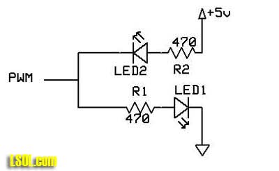 In order to use this with PWM all you need to do is to substitute the PWM output pin on the Picaxe for the variable resistor. Now when the Picaxe sends out PWM pulses the LEDs will see a signal that is negative for some of the time and positive for the other. The higher the PWMOUT value, that is the closer it is to 5 volts, the brighter the first LED will become and the dimmer the second will be. As PWMOUT goes closer to zero volts the second LED will brighten as the first dims. By varying the PWM output we can have the pair of LEDs see a continuously changing voltage that goes from zero to 5 volts and back to zero again, giving continuously changing brightness. As with the variable resistor, when the PWM duty cycle is 1/2 on and 1/2 off the LEDs' brightness is equal.
