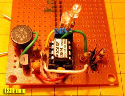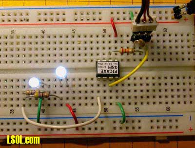 The photo below shows the small number of parts required to make this all work! Keep in mind that the plug, resistors and yellow wire in the upper right are only needed for programming. (Note: If you are not using the programming resistors in your circuit make sure you connect pin 2 to ground. The Picaxe will NOT work if pin 2 is not connected to either ground or the programming resistors.)