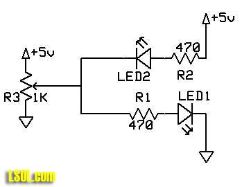 The following schematic should give you a good idea of what comes next when the circuit is connected to a microprocessor. The two LEDs are still wired back to back but the anode of LED2 is connected to + 5 volts and the cathode of LED1 is connected to ground. The connections on the left are joined together and are run to a potentiometer (variable resistor) that can be turned to vary the voltage from zero volts to 5 volts.