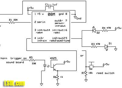 ANOTHER THOUGHT There was some discussion about ditch lights on the LSOL forums as I was preparing this article and I would like to add one more modification that speaks to these comments. Many observers reported that they had seen trains flashing their ditch lights when they blew their horns. At other times the lights were on but did not flash. To duplicate this behavior all we have to do it use one of the remaining Picaxe pins to trigger the ditch lights so that they stay on for a set number of seconds or repetitions. To activate the ditch lights this pin can be connected to the horn activation contact on the sound board. This is best done through an optoisolator. An optoisolator is a 6 pin integrated circuit that contains an encapsulated LED and light detector.