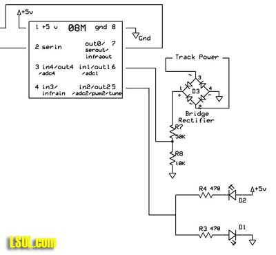 The bridge rectifier in the schematic is necessary because your track or battery provided power can be reversed to change the engine's direction. Bridge rectifiers provide consistent positive and negative terminals. If you are using an on-board power supply circuit that has a bridge rectifier you can use that connection to feed the voltage divider and "in1" on the Picaxe. The modified code is below. It still uses the READADC command to get the voltage. In addition a line was added to test for the track voltage being above a reading of 120. If it is the program jumps to the end where the LEDs are set to the same brightness. Adjust this value to change the point where the flashing will stop. REM d.bodnar 4-25-06 rev1 REM ditch light experiment SYMBOL led = 2 SYMBOL temp = w0 'for/next variable SYMBOL RatePin = 1 SYMBOL Rate = b8 SYMBOL skip = b9 skip = 30 REM higher rate = slower flash REM higher skip = faster rise/fall of flash again: FOR temp=0 TO 1023 STEP skip PWMOUT led, 255, temp READADC ratepin, rate IF rate > 120 THEN AllOn: rate=rate/20 PAUSE rate NEXT temp FOR temp=1023 TO 0 STEP -skip PWMOUT led, 255, temp READADC ratepin, rate IF rate > 120 THEN AllOn: rate=rate/20 PAUSE rate NEXT temp GOTO again:AllOn: PWMOUT led, 255, 512 'set PWM to middle value GOTO again: | The circuit can easily be constructed on a simple circuit board such as Radio Shack's 276-148. The prototype that I wired is shown below, both front and back. The bridge rectifier is in the upper left, the programming circuit in the lower right and the voltage regulator in the lower left. The two bare wires visible in the two photos are the inputs to the bridge rectifier.