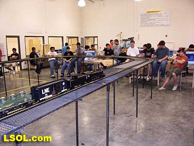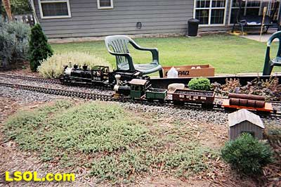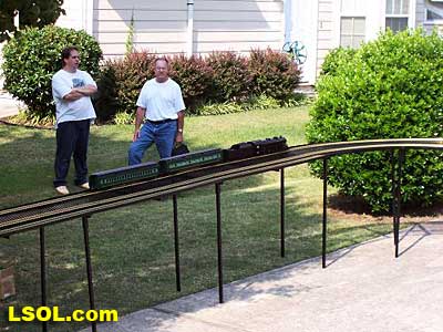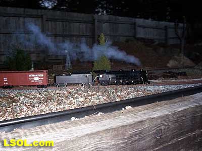 Then we fired up the steam engines. Chris was running an Accucraft C-16 pulling AMS freight cars on the inside track, while I was running an Aristo-Craft Mikado pulling Aristo-Craft heavyweight passenger cars on the outside track. The test of the track went fine. We had more then enough room in the curves to pass each other.