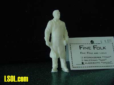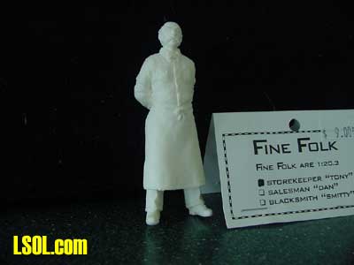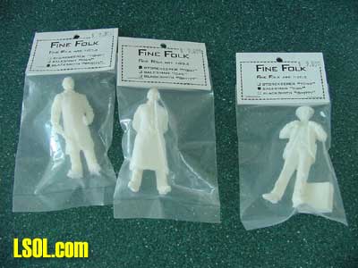 They are all standing figures and are molded in white hard plastic. Like the original "Fine Folk", they come in clear plastic bags and are very well made. Unlike some people that have been reviewed recently in magazine articles, they are completely free of air bubbles and have excellent details. The hands on these figures are molded precisely. This is a true test of excellence in figure molding. The surfaces on the clothing are very realistic and the skin on the face, hair and hands is perfect. The mold lines are very faint and two of the three figures had almost no flash.