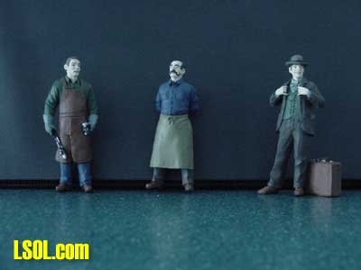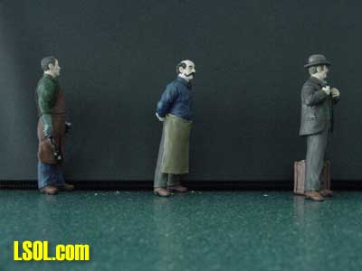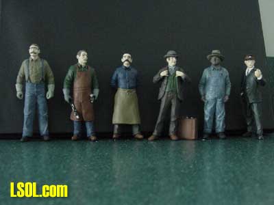 All of the flash was easily removed with a sharp hobby knife and very fine sandpaper. After cleaning each figure with dish detergent, I primed them in black and then painted them. They make a welcome addition to the growing number of townspeople on my outdoor railroad. "Blacksmith Smitty" is dressed in a long-sleeved shirt and jeans, with a leather apron and gloves. He has a hammer and tongs in his hands. "Storekeeper Tony wears a denim shirt, pants and has an apron tied around his waist. He has a handsome looking handlebar mustache and is balding. Standing with his hands behind his back like many storekeepers do, he is waiting for us to make up our minds about what we want to select. "Salesman Dan," wearing a three-piece suit and a bowler hat, is standing with his hands on his jacket in the typical salesman pose. He has his suitcase of samples at his feet and a couple of packages in his suit coat pockets.