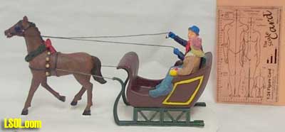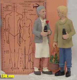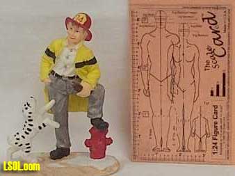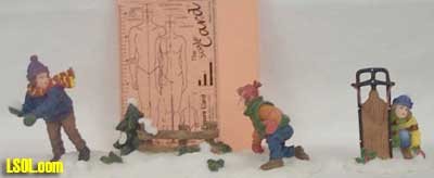 Many of us have found a great source of figures to supplement those marketed by the normal Large Scale Suppliers of figures and accessories. These are the "resin" Christmas Village figures marketed at Christmas by a number of discount, craft and other stores. I have acquired some resin figures each year at Christmas to supplement my normal "G" scale figure assortment.  These are some Victorian Christmas Village figures that are a little small for 1/24th, but may work well in 1/32nd scale scenes. Some of these figures are more suitable for railroad scenes than others with some being limited to seasonal use. Others will require some minor modifications to make them more acceptable. The sizes of these figures vary widely and do not appear to be made to any particular scale. This is similar to the large-scale figures marketed as "G" scale by train suppliers. I have found that even figures from the same manufacturer vary in scale, but that's a topic for another time. The point is that even though there is variation in the scale of these resin Christmas Village figures, it is no better of worse than what we see already in figures sold for the railroad. I try to work the placement of these figures so that the figures in a group are relatively the same proportion. Also you can work with some slight variation in size as long as they look right. Humans come in all sizes and shapes so there is the opportunity to utilize figures of varying sizes so long as the proportions are not inconsistent. One problem is head size. Most adult humans have heads that are close in size; this needs to be taken in to account when you make your figure selection. A short figure with a small head will not look good next to one with a properly proportioned head even if the heights appear to be compatible.  The Scale Card Some time ago I purchased a couple of the Scale Cards that give the dimensions of figures in the various scales of 1/29th, 1/24th, etc. If you have not seen these, they are clear plastic with the information engraved on them and are about the size of a credit card. I carry the one for 1/24th as it is a good compromise for my purposes. Many of my trains are 1/29th although some are 1/20.3 or 1/22.5, but my buildings are generally built to 1/24th as it's simple to calculate dimensions, and many of the available doors and windows are 1/24th. Likewise vehicles are commonly available in 1/24th or 1/25th scale. Therefore, I find 1/24th a reasonable compromise for figures unless they will be placed in an engine cab or next to some other structure that would look odd.  An example of a Town Square figure. The snow mound is provided for stability in traditional Christmas displays but needs to be sanded off for our use. I have used my Scale Card to find a number of useable figures at after Christmas sales at places such as Lowe's, Michael's, and Wal-Mart. Lowe's carries a line called Town Square that features Coca-Cola products. It seems that even within this line, the figures vary in scale. However, I have found that a number of them are very close to 1/24th scale with some ranging up to 1/20th scale. Although these are not a super bargain at around $6.00-$7.00, they can be found on sale after Christmas for about $3.00 each. I like the variety they add as they are limited production so you don't see them everywhere. One drawback is that they are all holding Coke bottles, which you may want to remove and you will have to deal with the snow mound that all of these figures are standing on. I have had good success at sanding them carefully on a stationary belt sander. I use the sander to remove the bulk of the snow and as I get close to the feet, I stop sanding and finish up with a sharp hobby knife and a pair of small, flush cutting, wire cutters.) The positive aspect of these figures is that some are people in various poses that you can use at times other than Christmas. You don't need a Scale Card if you have a dollar bill or a credit card. A dollar bill is 6 1/8" x 2 5/8" and most of us have at least one. If you fold it in half, that is just over 3 inches or six feet in half-inch scale. If you want to be closer to 1/29th scale use the width as that comes out to just a little over six scale feet in 1/29th scale. If you don't have any cash you can use a credit card.  These are a couple of Town Square shoppers that are close to the 1/24th Scale Card, but would be closer to 1/20.3. A standard credit card is about 3 3/8s inches long. That comes to about 6 ft. 4 inches in 1/22.5 scale or about 5 ft. 8 inches in 1/20.3 scale. I often use this trick to get a quick idea of the relative size of a figure.  Some kids from the Wal-Mart collection. This year I found some useable figures at Wal-Mart. They are part of the Village Collectibles line and although many are too small for most purposes, the ones of Children are very close. They are also quite reasonable, as a set of three kids is only $3.00. The drawback is the fact that they are all participating in winter sports and have on winter clothes, so their use is limited to winter layout use or Christmas displays.  A Lemax Christmas scene where the figures are just about right for 1/24th scale. The other choice is Lemax. They are sold at a number of places including those mentioned above. Their figures seem to vary widely in scale also, but I have found several large pieces with figures that will work nicely in the nominal 1/24th scale realm. Some or these are pictured with the Scale Card for comparison. They suffer the same problem as the Wal-Mart figures in that they are all dressed for and engaged in wintertime activities. I enjoy searching out these figures to add variety to my scenes. I found out recently on LSOL that you are not limited to purchasing these at Christmas time as there is a collector site for the Town Square figures that deals in previous issues as well as current production figures. These can be purchased from the site at anytime, but be prepared to pay 