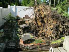 The fallen oak damaged some of the miniature buildings the Browns have collected over the years of their shared railroading project.