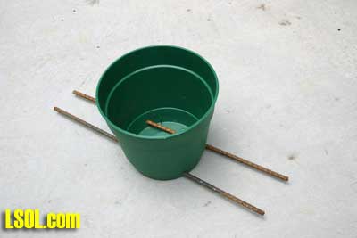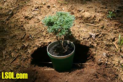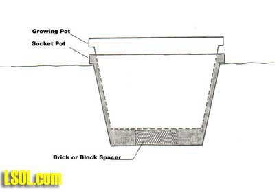 Okay, all of you that do not want to have live plants on your outdoor large scale train layout, raise your hand. You folks may be excused. Before you leave might I suggest that you pave your back yard and do away with the weed problem that you have. Now. . . you folks that are still here, how many of you have less than a green thumb? Just as I suspected, the majority of you. Hey! I can kill a plant with the best of them but, I am always looking for ways to avoid killing them AND I'm always trying to do things easier. That brings me to the topic of pot-in-pot. An idea "borrowed" from the plant nursery business. Those guys have discovered that by growing a plant in a container (Growing Pot) while that container is inserted into a second container (sleeve or socket pot) really makes life easier. The sleeve/socket pot in turn is inserted into the ground. (See figure 1)  I wish I had all of the "non-plant" people back. I would want to ask them WHY do you not want to have plants? I'll bet some answers would be; ". . .plants are too much trouble to keep alive."; or , ". . . I hate having to get down on my hands and knees to prune or trim them."; or maybe "the dirt in my yard won't grow anything." The excuses can be endless. While using pot-in pot will not solve all of the chores or problems in having plant material it can make things easier. Growing a plant in a container, in another container, isn't the whole picture. For example the guys who have dirt (see above) can easily over come their problem by using a growing media in the growing container that is much more supportive of good plant growth. Modified Growing Media Supplying correct amounts of water and fertilizer to plants is a function of a good growing media (soil if you like). Being loose (friable) enough to allow good root penetration is another characteristic of a good growing media. Did you ever look at what plants are growing in that you purchase in containers from a local nursery or garden center? Odds are there is little or no soil (definitely not dirt) in the pot. It is a "man-made" growing media. The recipe can vary from grower to grower but peat moss and/or bark are likely to make up the bulk of the media around the roots. And those little things that look like bug eggs on top? Fertilizer! Actually slow release fertilizer. Now, lets take a lesson from those growers. Let's not plant our plants in dirt, but, instead, plant them in a container with a mixture of peat moss and, say, sand and good top soil. About a 2:1:1 ratio. That is two parts peat moss + one part sand + one part top soil. That is a recipe that has worked for me. (But, trust me, there are thousands of possibilities for good growing media recipes. ) Now this combination can provide a good supply of water to the roots provided rainfall and watering is adequate. But, those combined ingredients probably will not provide adequate fertility for good healthy plants. That is where the bug eggs (OH sorry) the fertilizer comes in. You can purchase slow release fertilizer at any reputable garden center or plant nursery. All the way from small bottles for house plants up to boxes or bags weighing upwards to 40 or 50 pounds. The key is slow release. Why? You put the recommended amount (check the package) on the top of the growing media in the early spring; keep the plant adequately watered (that can be another topic for an article); and you are good for an entire growing season. Now for you folks that don't want to bother mixing your own growing media there are several good potting mixes on the market. Select a brand name potting mix such as Miracle-Grow and avoid the "Brand-X" medias. You will be glad you did. Mechanics of Pot-In-Pot Now that we have established that we need to modify the stuff in which the plant grows, lets look at the mechanics of using the pot-in-pot technique. In the nursery business they make special growing/sleeve pot sizes but for us outdoor train folks we can simply use two containers of the same size assuming they are made with a taper on them where one will fit into the other. Most plant containers are made that way so a source of containers is not a major issue. Let's first take a look at the sleeve or socket pot. It should be buried in the soil so that the top of the container is flush or slightly above the surface of the ground. It doesn't really matter as long as the top of this container is eventually hidden with a mulch cover, (See figure 2)  One problem that might be encountered with this sleeve or socket pot is that it might have a tendency to "stick" to the growing container if there is a need to pull the growing pot (with the plant in it) out. The idea is to have the socket/sleeve pot to stay in the ground to accept the growing pot when replaced. There are at least a couple of easy ways to avoid this possible problem. One is to anchor the socket/sleeve pot in the ground. I use short pieces of steel rebar poked through the pot and protruding out the sides. (See Figure 03)  The pot is then buried with the rebar sticking out into the soil. This will typically be enough of an anchor to hold the pot in the ground. (See Figure 04) Another option is to place a spacer such as a brick or block of wood in the bottom of the socket/sleeve pot to keep the growing pot from coming into direct contact with the socket/sleeve pot. (See figures 5 and 6) This will cause the growing pot to be perched a little higher but if a good layer of mulch is applied no one will be the wiser.  So . . . why bother?  There are several benefits of planting your major plants in containers. Particularly if you are an old codger like me who hates to get down on your hands and knees to maintain your plants like shaping and pruning a plant to look like a miniature tree. I can simply pull the plant out still in the growing pot; take it to a comfortable work bench or table; do my work such as pruning or adding slow release fertilizer, etc; then stick the plant back in the ground i