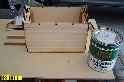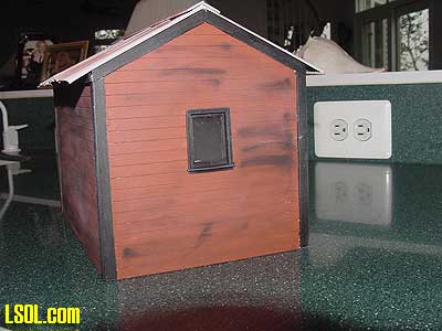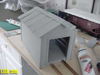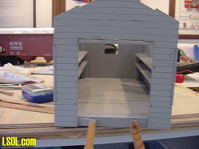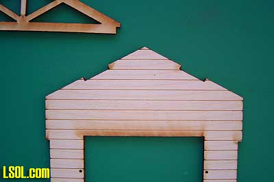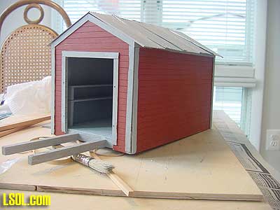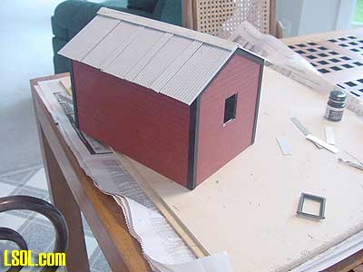 You will notice in this picture that the building sides and ends are slotted to make construction easier. These slots were covered by the trim to give the building a realistic look. Because the speeder shed is for my outdoor railroad, I painted it the red color that my other railroad support structures are painted.