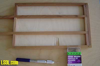 I used small brads to help hold the sides and ends together and fasten them to the base and the support posts inside. I pre-drilled the holes for the brads using my pin vice and a very small bit.