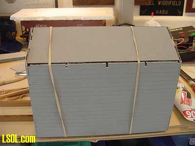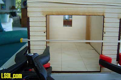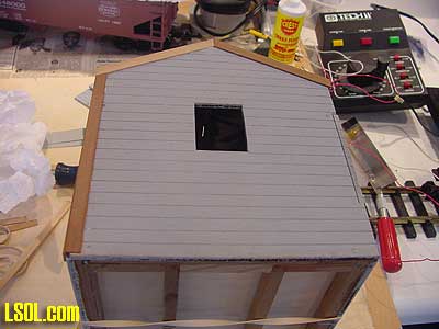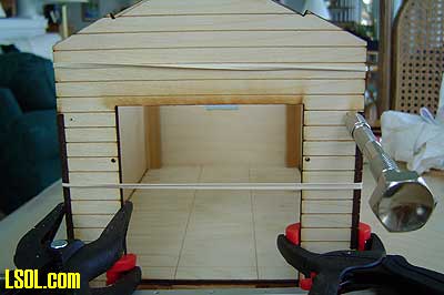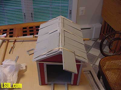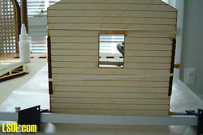 The whole roof construction was the most difficult part of the project. I finally got all of the pieces in place and used scrap wood, styrene strips and rubber bands to hold it all together to let the glue dry.