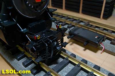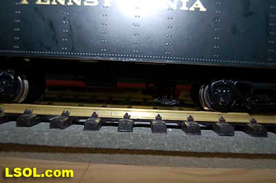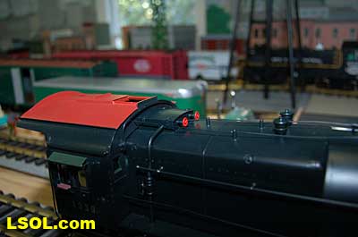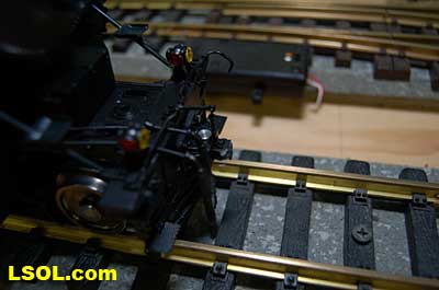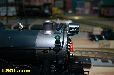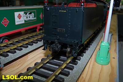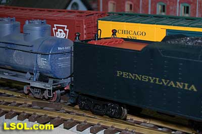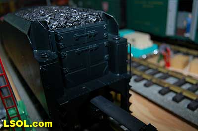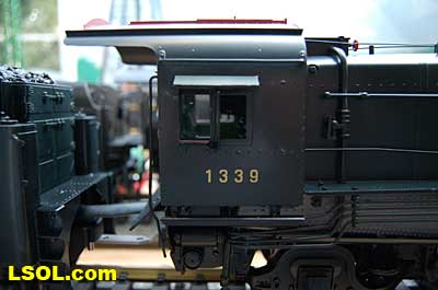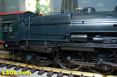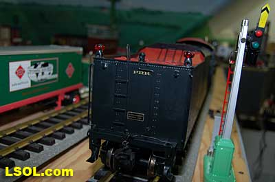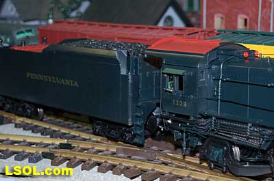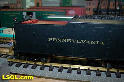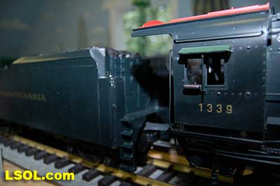 The prototypical green interior walls and the backhead details are very sharp with the valve wheels painted the correct red.  The cab windows have a sunshade and elbow padding as on the prototype.  The high headlight and number board with a generator just behind is a trademark of Pennsy locos.  Accucraft has a real brass bell and the sand dome, with the sand lines running down to the drivers, are very accurate.  The brass whistle needed to be re-glued, but the rest of the top of the engine is completely accurate.  The cab roof is painted in a dull red and has a working roof hatch.   The locomotive has a steel drawbar with three holes for connecting the tender at various distances from the locomotive.  The tender has a fairly wide electrical connector that plugs into a receptacle on the loco.  The tender has a very detailed front wall with prototypical multiple coal doors molded into a single piece.  The tender is painted the same black/green as the loco and has a dull red top deck behind the coal load. The water bunker hatch and ladders are very nicely done.   A water scoop is attached under the tender. It appears to be more fragile than the ones found on the NYC Hudsons.  The rear of the tender contains a builder's plate, and has a handrail and ladder attached. Missing is the coal and water capacity lettering that I am used to seeing on the NYC tenders. Apparently the PRR did not put that info on the back of the tender. The plate includes the number, class and engine number.   The tender top deck and coal load include several fine details found on the prototype