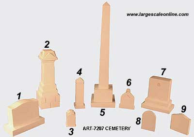 These are more in the category of monuments. We saw some just like these on our trip to the National Convention in several of the older Mid-West Cemeteries. My son remarked that we would not use the tall one in the cemetery. When we got a set we could keep. It looks just like a monument he had seen in the town square of a small town and he wants to use it like that on our railroad.