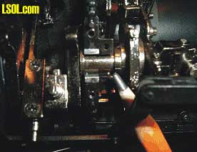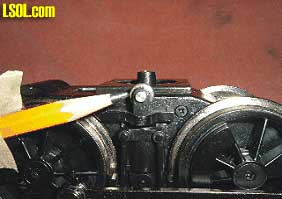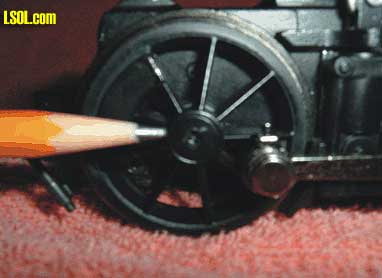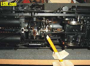 Looking Into the Locomotive Through the Ash Pan Hole Notice a large bundle of wires coming out of the hole that go to the tender and attach to the main PCB. There is room to move the wires aside in order to install a speaker. Partially blocking the view, toward the bottom of the ash pan hole in the picture is the drive shaft that extends to the rear truck. You can just make out one of the universal joints on the right under a brake rod clevis. The object down in the hole to the left with the green edge is the reflective housing for the fire box light. Once the wire bundle exists the ash pan it is covered by a plastic trough from that point back to where entering the tender. Looking back at the ash pan notice there is a series of openings down the center of the pan. These are the only openings for the sound to exit. There are similar openings under each of the ash pan halves. It may be necessary to cut openings in the two ash pan halves, where they face each other in order to allow for more sound. Removing material from the ash pan halves that face each other would not be noticeable unless the engine were turned upside down.  Crank Shaft Slip Joint The pencil tip is pointing to the slip joint built into the crank shaft. The crank shaft is made in two pieces. The front half of the crank shaft, driven by the front motor block, drives the valve gear. The back half of the crank shaft, driven by the rear motor, drives the cylinder connecting rods. The two halves of the crank shaft are jointed at the point indicated by the pencil. The one half of the crank shaft slips into the other half. The purpose for a two piece crank shaft is to eliminate a torque problem that plagued the Climax when it was first introduced. Bachmann solved the problem by using this two piece crank shaft. To the left in the above picture is the cylinder connecting rods. To the right of the picture is the value train eccentrics. Another example of insightful engineering.