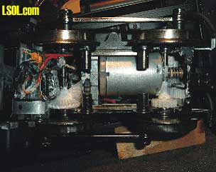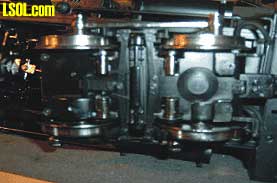 Front Motor Block  Notice Addition of Roller Side Bearings The motor blocks are easy to remove. Motors are attached to bolsters that mount with screws placed through the side frame. Removing these screws allows the motor blocks to drop out. The exploded diagrams supplied with the engine identify the location of these mounting screws.