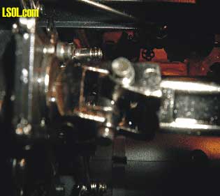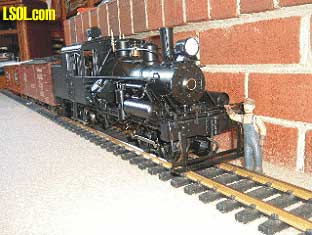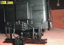 Rear End Beam Detail You will notice that the bottom of the rear sander sets too close to the L&P draw head. As built it is not possible to remove the pin from the draw head. If you plan to use the draw head with L&P rolling stock then a modification will be in order. I should mention that the cut bar was removed for this picture and in preparation to modify the location of the sander tank. Simplest solution would be to remove the draw head. The draw head is held in place with one screw off set to the right in the center pocket. Remove the draw head, remove the pin, install a short tow bar, re-install the pocket and you're in business. Or remove the sander tank and move it up higher on the tender. The sander tank can be removed by releasing it from inside the tender. There is a lug that holds the tank in place. Move the lug to a vertical position, remove the sander hoses, then wiggle the sander tank free. There is a second round mounting bracket molded on the tank. It is just pressed into a hole in the tender shell. Move the tank up enough to allow clearance for the L&P pin. The upper edge of the tender shell can be notched to accept the top mounting lug of the tank. The lower tank round lug can then be fit into what was the lower part of the upper mounting hole. Once in place the coal load can be replaced, sander lines reattached and you are in business. Also, as it comes from the factory the cut bar can not be raised as the coupler pin lifting arm hits the sander tank. Moving the sander tank to a higher position will allow the cut bar to be used if so desired.