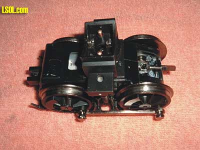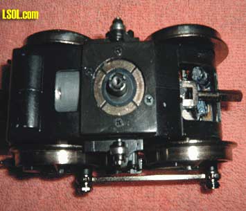 Top View of Motor Case Showing Universal Joint and Drive Shaft Collar The opening in the motor case to allow exit of the drive shaft has caused some concern among Large Scale operators. These folks think that having an open motor case will lead to the introduction of foreign matter that will damage the gear train. Only time will tell if this concern is with foundation. I've run Lionel LS engines with exposed drive gears for years without any adverse effect being caused by dirt, grit, etc. The opening in the Heisler's cases is up on the top end and is protected to a certain extent by the chassis of the locomotive. Note in the above picture, especially the area just above the opening, that the case is molded in two halves. The case consists of a left and right half with a bottom cover, as mentioned earlier in this article.  Metal Universal Joint The Heisler employs metal universal joints throughout the drive train. These universal joints are very similar in design to those used on the drive shafts of motor cars. Unlike the Shay and Climax, the all metal universal joints should prove to be more robust. In addition to the metal universal joints the Heisler uses square slip joints on the drive shafts. These slip joints are metal and similar in design to those used on previous geared locomotives. Lubrication of the universal joints and slip joints should be accomplished on a regular basis to avoid excessive wear and failure. Drivers are attached to the axles by means of a center mounted screw. Drivers are not interchangeable between the inside frame and outside frame models of the Heisler. The inside frame Heisler's drivers have crank pins for attaching the side rods. On the outside frame versions the counterweights have crank pins with the drivers being plain.  Center Mounting Hole For Phillips Head Screw Recommend that the driver screws be removed to add a small drop of Loctite 222. Using Loctite 222 will help insure drivers stay tight on the axles. When installing the mounting screws tighten them snugly but do not over tighten. Use caution so that the insulating washers and mounting collars are not misplaced. Refer to the exploded parts diagram for proper sequencing of the mounting collars and spacers. As previously mentioned the motor blocks are easy to remove from the locomotive. Power is passed between the motor blocks and the main PCB by spring loaded contacts. The following pictures show these contacts.  In the first photo the four electrical contacts can be seen inside the bolster's center box. These spring loaded contacts make contact with four brass strips mounted in the body of the locomotive. Note the large head Phillips screw that attaches the bolster to the king post of the power truck. Also the universal joint almost directly over the axle on the right side of the picture. Directly below the universal joint is the PCB mentioned earlier. The second photo shows the segmented contact ring mounted on top of the power truck. The king post is visible in the center of the ring. The spring loaded contacts mounted in the bolster make contact with these four segments. While not mentioned in the Bachmann instructions these contact rings should receive periodic lubrication. Just a small drop of light oil or Conducta may be added by tipping the engine on its side to apply the lubrication. Note also the side bearing roller on each side of the power truck. Let's take a quick look inside the cab and the tender. The cab roof is held in place with four very tiny screws along the top edge of the front cab wall. Additionally there is one small screw on each side of the cab walls at the very back just below the roof line. Removing these screws allows the cab roof to be removed. After removing these screws very carefully lift the cab roof slightly, just enough to disengage the roof vent brace. Pulling up too far on the cab roof will break the brace. Once the brace is disengaged from its latching bracket the roof can be removed.  Cab Interior With Roof Removed The brass strips in the lower portion of the picture provide power to the cab interior light. The light is centered just under the cross brace that carries the brass power strips. The cab light is not real bright so that it does not distract ones attention. The brass strips also provide power to the reverse light mounted on top of the cab roof.  Back Head Detail The back head seems to be very complete. The Johnson bar is operational with a reach rod going to the valve gear. For all of its detail for some reason Bachmann neglected to install a throttle. That is twice now that the throttle has been left off one of their highly detailed Spectrum models. At the ECLSTS I'll have to ask H. Lee or the Bach-Man about this obvious oversight. Too bad this had to happen on such a highly detailed model. Either the throttle is missing or there is some other way to apply steam to the cylinders. The flickering fire box light works well on the model I have and is visible in all but the brightest sunlight.