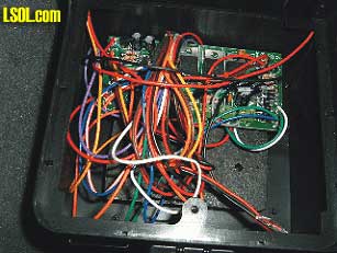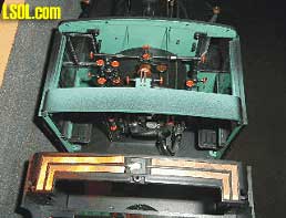 Coal Load Side View with Water Hatch at Lower Right With the coal load removed we'll take a look inside the tender. The tender contains the main PCB and a large flat weight along with enough wires to wire up a small town!  Another View Inside The Tender See, I mentioned there was enough wire to do a small town. The main PCB is mounted toward the front of the tender almost touching the back wall of the cab. Under the PCB is the tender weight. The weight covers the floor just about front to back and side to side. The hole seen in the lower part of the picture is where the coal load attaching screw goes through and into a metal stand-off that extends down to the floor of the tender. From what I've checked so far the color code of the wires match that of the color codes depicted on the exploded view wiring diagram. The wires trailing down to the lower right hand corner of the picture are those coming from the chuff contacts in the cylinders. By the way, the four wires referenced by Dave in his article are intended for use when installing a DCC decoder. The last several Bachmann locomotives have included these wires. The last place to look is under the locomotive. Here we'll take a look at the ash pan and crank shaft.