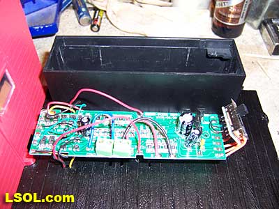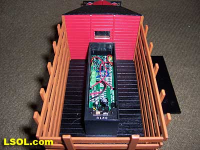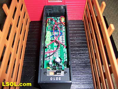 The circuit board is contained within a long plastic box mounted in the truck's bed. The circuit board is not sophisticated. The board serves as a central connection point for track power, supplies the LED lights, and wiring for the combination NMRA/Large Scale polarity switch. In fact, the circuit board could be removed for running the truck with either rail or battery power.