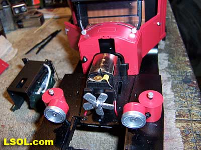 The can motor is of more compact design than motors used in other Bachmann products. The sides of the motor case are somewhat flat thus allowing the Buick engine cover to fit tight up against the sides of the can motor. Notice the fan blade mounted on the protruding motor armature shaft.