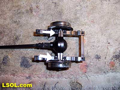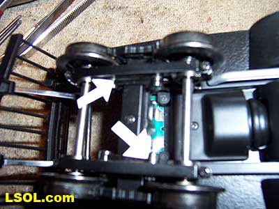 In the above view the electrical pickup that conducts power from the wheels to the front PCB is highlighted. There is a pickup at each wheel. Two of these four pickups are designated by the white arrows. Bachmann uses a unique pickup to contact the wheels.