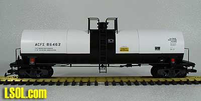 After the ECLSTS I came home and found several boxes had arrived at the office. I had lots of work to finish after the show so I had to wait to open them. The first box I opened was from LGB. They had sent me one of their new ACFX Modern Tank Cars. The model was LGB40870. The LGB web site says, "Over its 100-year history, American Car and Foundry better known as ACF has been America's leading maker of rolling stock, and you'll find its leased ACFX freight cars on railroads across the continent. Just look and you'll see these modern tank cars carrying liquefied gases to industries everywhere."