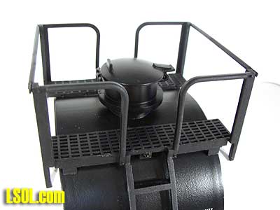The lower hand rails at the ends and bottom are made of metal, but the upper hand rail assembly is molded plastic. The plastic that it is made out of is a more bendable type. The top handrails are not round, but flat on the back side due to the molding process. One advantage I see is this plastic is bendable, so it would be very hard to break when carrying. I like many of you am not a 100% expert on every engine or rolling stock ever made. I like to research new pieces on the Internet and see if the model looks like the real thing. One thing that I like to do when I get a new piece of rolling stock is to turn it into a learning experience for me and my son. In my studies I found a few web site about tank cars that you might find interesting too.