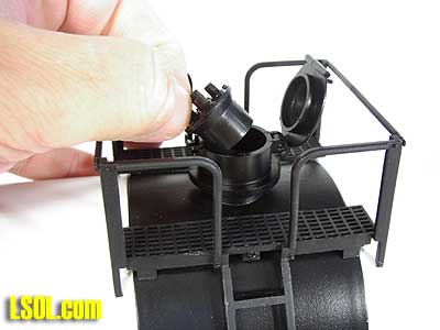 It really holds water and has a exit drain at the bottom of the tank. Experiments by Bryan and me show that the tank holds about 5 cups of water. When full of water the car weighs about 4.8 pounds. To drain you just remove the cap at the bottom, and you of course have to open up the top and remove the plug. A good science experiment for my son. I removed the cap from the bottom and nothing came out until I let air into the tank from the top. We found that the water drained at the rate of about one cup per 45 seconds and took about 5 1/2 minutes to drain. This does not have any kind of flow control or tubing, but looks more prototypical. So what can you use it for? I suppose you could put some type of drink inside, but then it could be hard to clean in the future. You might put some type of weed killer and run it around the track to keep them from growing in your ballast. Of course don't try this unless you know for 100% sure that the chemicals you use will NOT eat away at the plastic. You could end up with a real life Hazmat spill on your hands. Trucks and Wheels: