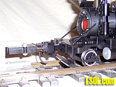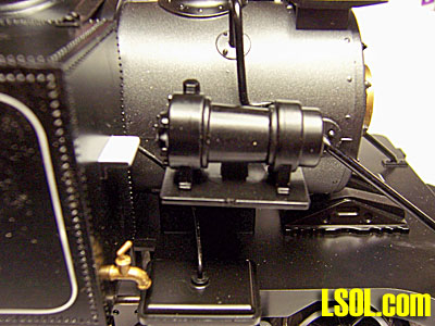 Mounted on the front pilot deck are two rerailers. Nice detail touch that dresses up the pilot deck.  On the left side of the engine mounted to the smoke box is a highly detailed compressor. It has full piping to include the steam regulator valve. Steam exhaust is routed into the smoke box. The air output line runs from the compressor to the rear behind the side tank.
